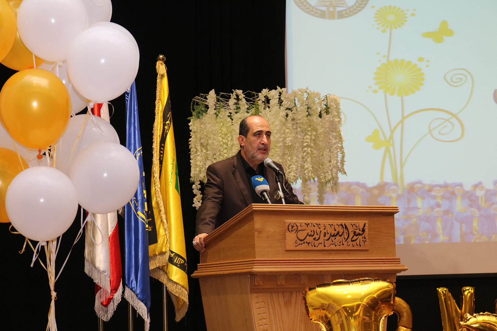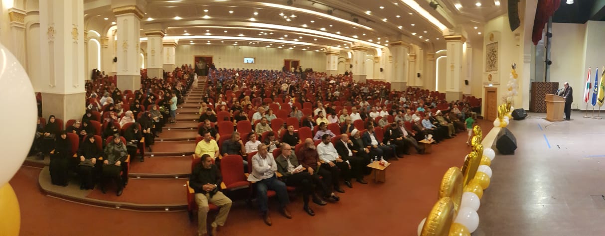 وقبل الختام كانت كلمة لراعي الحفل، استهلها بتقديم العزاء برحيل الحاجة آمنة سلامة (أم عماد مغنية) قائلاً أنها كانت: "نموذجاً بالصبر والثبات على الألم بفقد الأحبة، وكانت مواسية لأهالي الشهداء والجرحى"، ثم توجه للطلاب الخريجين مؤكداً أن: "العلم نور وليس مجرد وسيلة لتحقيق الثراء، وينبغي الحفاظ على قدسيته، فالله تعالى جعل كمال البشرية في العلم والعمل"، أضاف: "أنتم تأتون من بيوت مناضلة مجاهدة كادحة تتحمل الآلام فعليكم أن تصبروا وأن تتحملوا الصعاب"، وعلى الصعيد السياسي قال: "نحن نواجه حرباً ناعمة، هذا ما يسمى بالسيد الامريكي يحاول أن يتعاطى مع إيران النموذج الراقي للإسلام المحمدي الأصيل بتعالي وفرعونية، ولكن لا تأخذهم في الله لومة لائم"، وأكّد أننا "نواجه الغزو الثقافي في شتى الميادين، بهذه المسيرة وتضحياتها العظيمة، فلولاها ما كنا نحتفل هنا ونقدم شهادات التقدير، ونواجه التحديات والتهديدات على كل الصعد من أجل أوطاننا وأبنائنا ومستقبلهم".